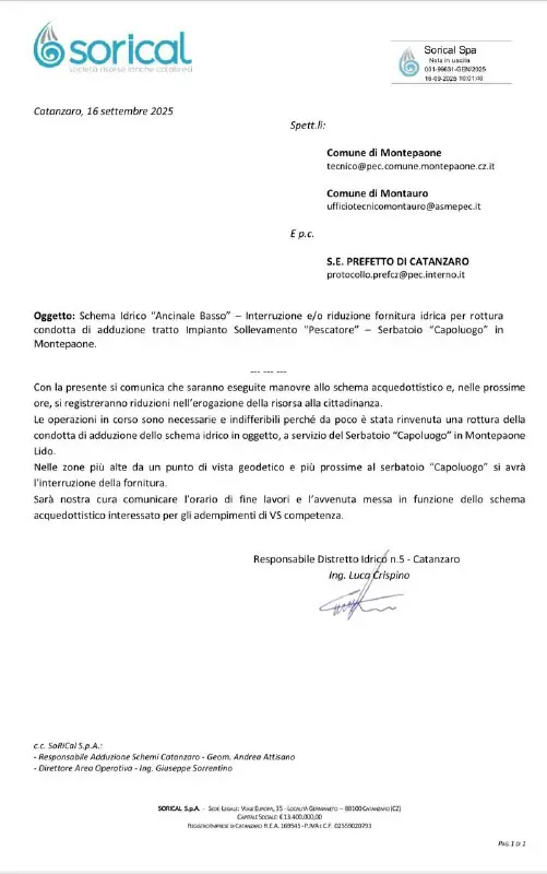 Spett.le Comune di Montepaone alla Cortese Att.ne Sindaco e Responsabile ufficio tecnico - Acq. Ancinale basso Comunicazione interruzione temporanea fornitura idrica domani 12.09.2025 riparazione urgente condotta premente. Come anticipato per le vie brevi e a seguito di due ingenti perdite domani 12